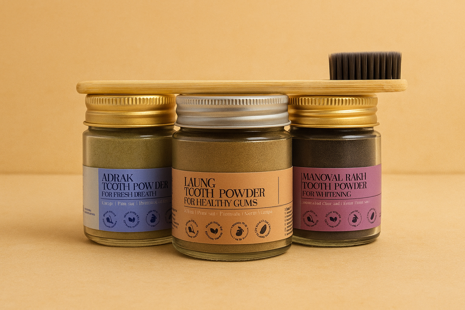 Carefully hand-pounded by the skilled women of Abidpur (UP) and Tumkur (Karnataka), our Laung, Mint & Adrak, and Coconut Charcoal tooth powders combine age-old wisdom with natural purity. They thoroughly cleanse teeth, strengthen gums, and protect against bacterial and fungal infections — leaving your mouth fresh, healthy, and naturally cared for.